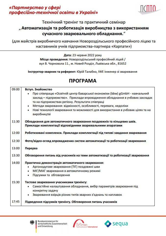 В Новороздільському професійному ліцеї в рамках німецько-українського проєкту «Партнерство у сфері професійно-технічної освіти в Україні» у четвер, 23 червня відбудеться технічний тренінг та практичний семінар зі зварювання „Автоматизація та роботизація виробництва з використанням сучасного зварювального обладнання“. Цей захід буде проведений для майстрів виробничого навчання Новороздільського професійного ліцею та наставників учнів підприємства-партнера «Карпати». Інструктор-зварник та референт: Юрій Талабко, IWE інженер зі зварювання TОВ «Фроніус Україна».